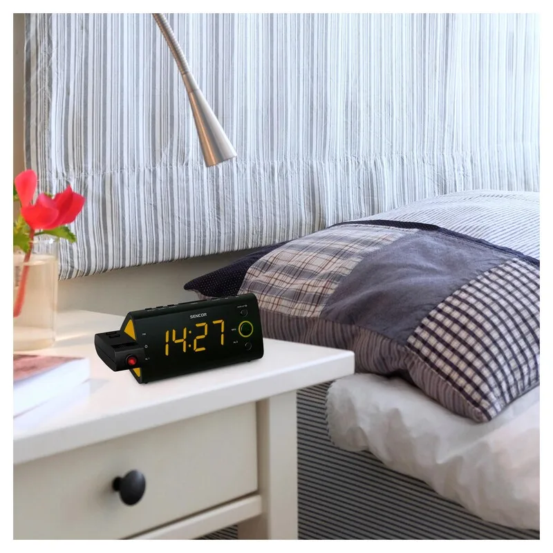 | Digitalni prikaz sata i frekvencije Godina/Mjesec/Datum LED zaslon 1,2″ (3 cm) Crvena projekcija sata Rotacija slike za 180° s podešavanjem fokusa PLL FM radio s 10 memoriranih postaja Unutarnja temperatura Dvostruki alarm s mogućnošću isključenja za vikend Buđenje uz zujalicu ili radio Odgoda buđenja (Snooze) Funkcija uspavljivanja (Sleep) Zaslon s podešavanjem jačine osvjetljenja (jako/slabo) Rezervno napajanje baterijom (baterija nije uključena) Napajanje: 230V ~ 50 Hz Dimenzije: 188 x 82 x 72 mm Težina: 420 g |